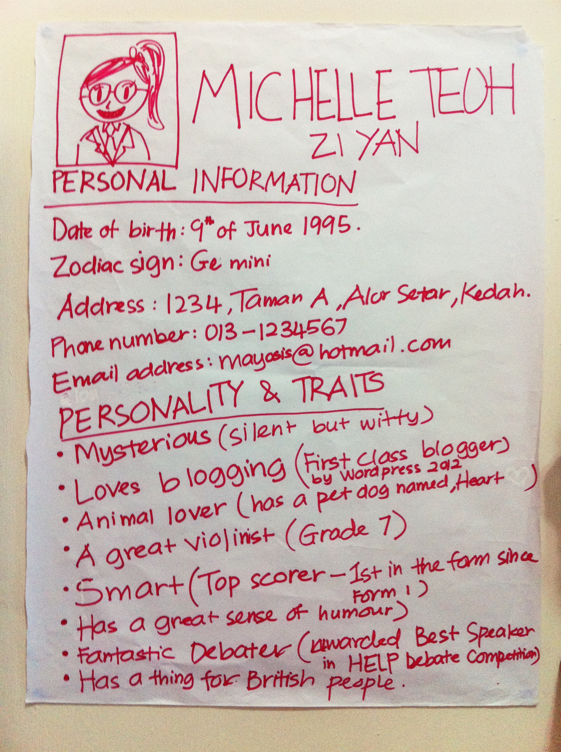 One of the aforementioned activities was having each group select a member among themselves and proceed to write a résumé for her. And the picture above, ladies and gentlemen, is Aifa, Anum, Lela, Benei, Eel, Eah and Diana’s résumé for me.