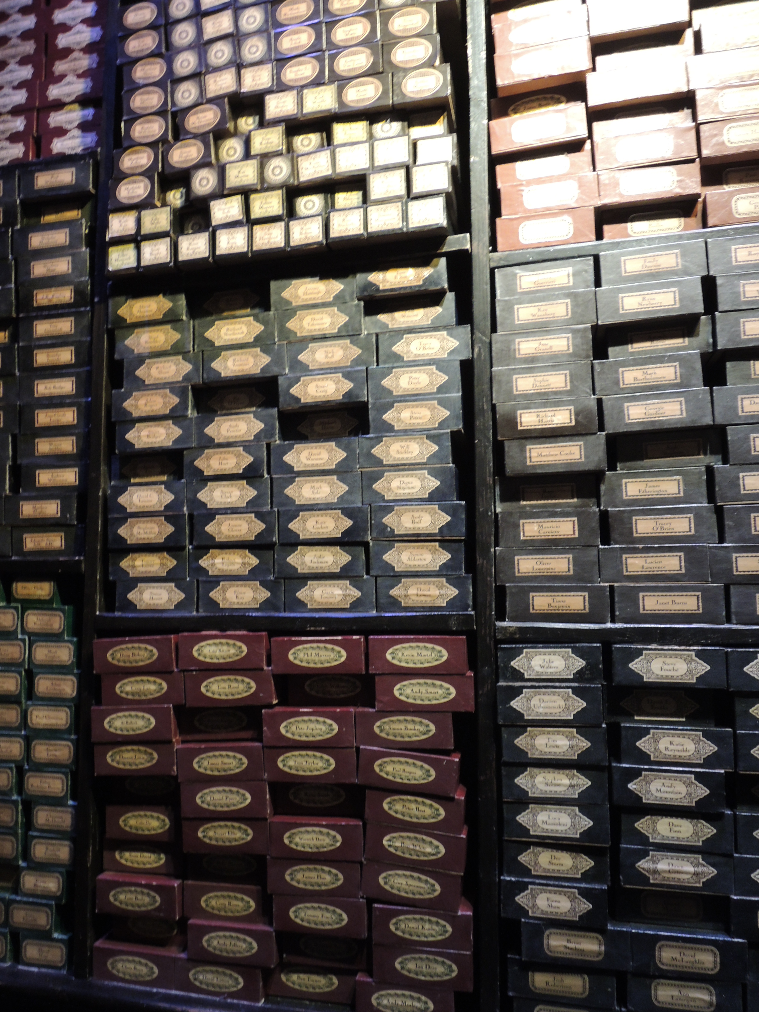 The next room was the last room, and it was a room made to look like Ollivander’s shop which was full of wands. But instead of boxes containing wands, it bore the names of every single person who contributed to the movies. I found the names the likes of James Phelps, Tom Felton, Rupert Grint, Nat Tena, JK Rowling and even Bertie Gilbert (who is currently 16 years old and played Scorpious Malfoy and is also a youtuber)!