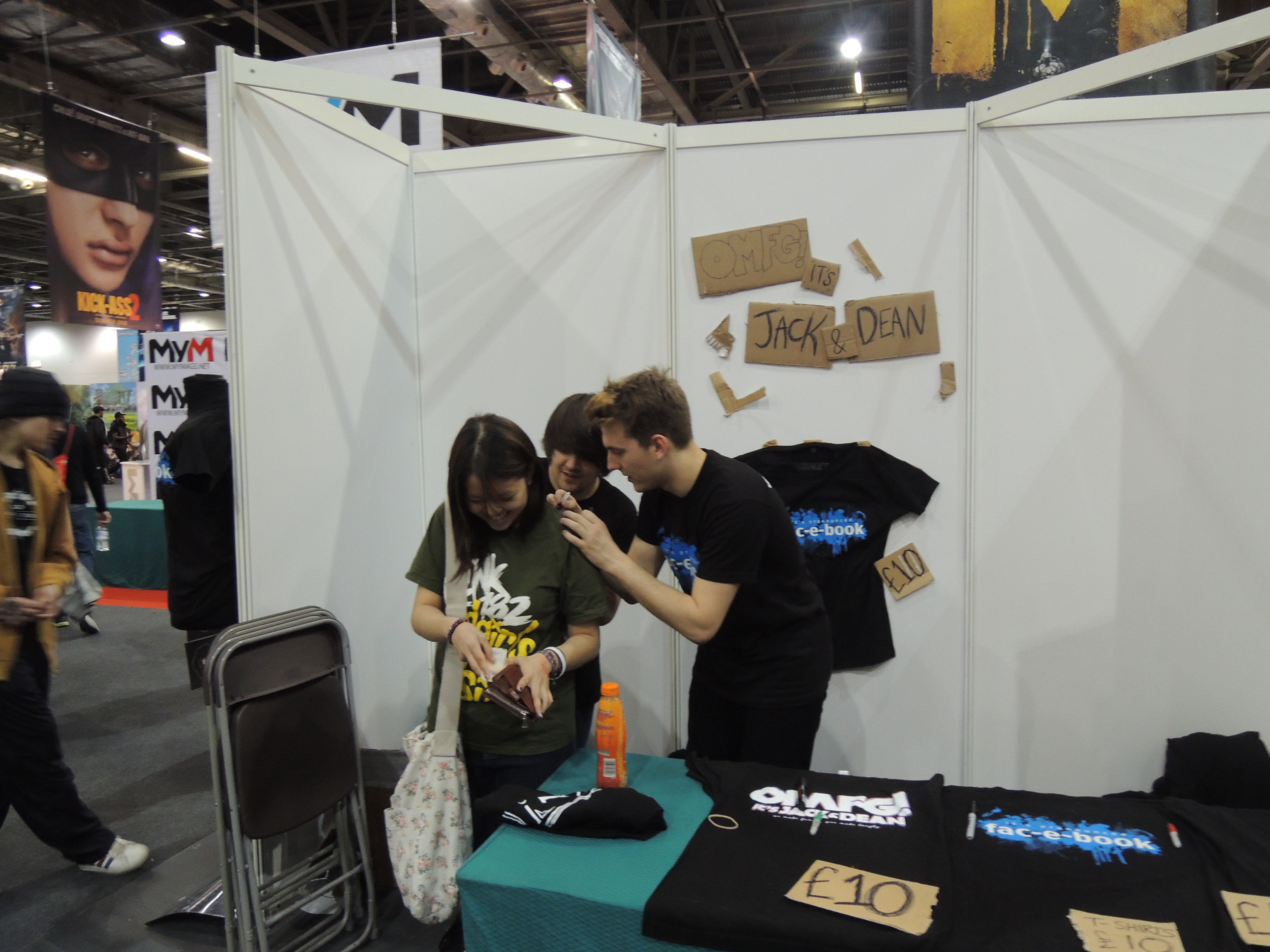 Soon it was my turn and I said “HI” a little too loudly when Jack and Dean looked up and on the outside, I was a clear and calm facade, all smiles, but inside I was a RAGING HORMONAL FANGIRL WHO WAS SCREAMING TO THE HEAVENS!!! I said I was from Malaysia and today was my last day in England as I’ll be flying home tonight and Jack said, “Oh, so you decided to spend your last day here at Nerdcon?” and I said yes and then I started to choose a shirt of theirs I wanted to buy and the shirt I chose, Jack said, “We only have this left in XL size” so I was um okay let me choose another one but then he said, “Wait you know what? Actually I think we have an M sized one here” and he took it out and I was like yeah is it okay if I get that one? I’m so dumb oh my god I wonder why they haven’t laughed at my dumbness yet and they both said “Yeah sure of course” and I paid and I NOW HAVE A TEN POUND NOTE GIVEN TO ME BY JACK HOWARD AS CHANGE. And then I said “Would it be weird if you guys signed my shirt” and they said “Yeah it’s no problem” and then they both signed at the same time and Dean said, “Oh, it’s blink-182 yeah we love blink we even wrote a song for them once” and Jack laughed and said “Yeah, we write songs for blink” and I just. I knew wearing my blink-182 shirt to Vidfest was a good idea. So after they signed my shirt I requested to take a photo with them and then I hugged both of them saying “thank you so much” endlessly and when I left the booth they said, “It was nice to meet you, have a safe flight home!” and I legit thought I was going to faint after that because my legs were shaking and had turned into jelly.