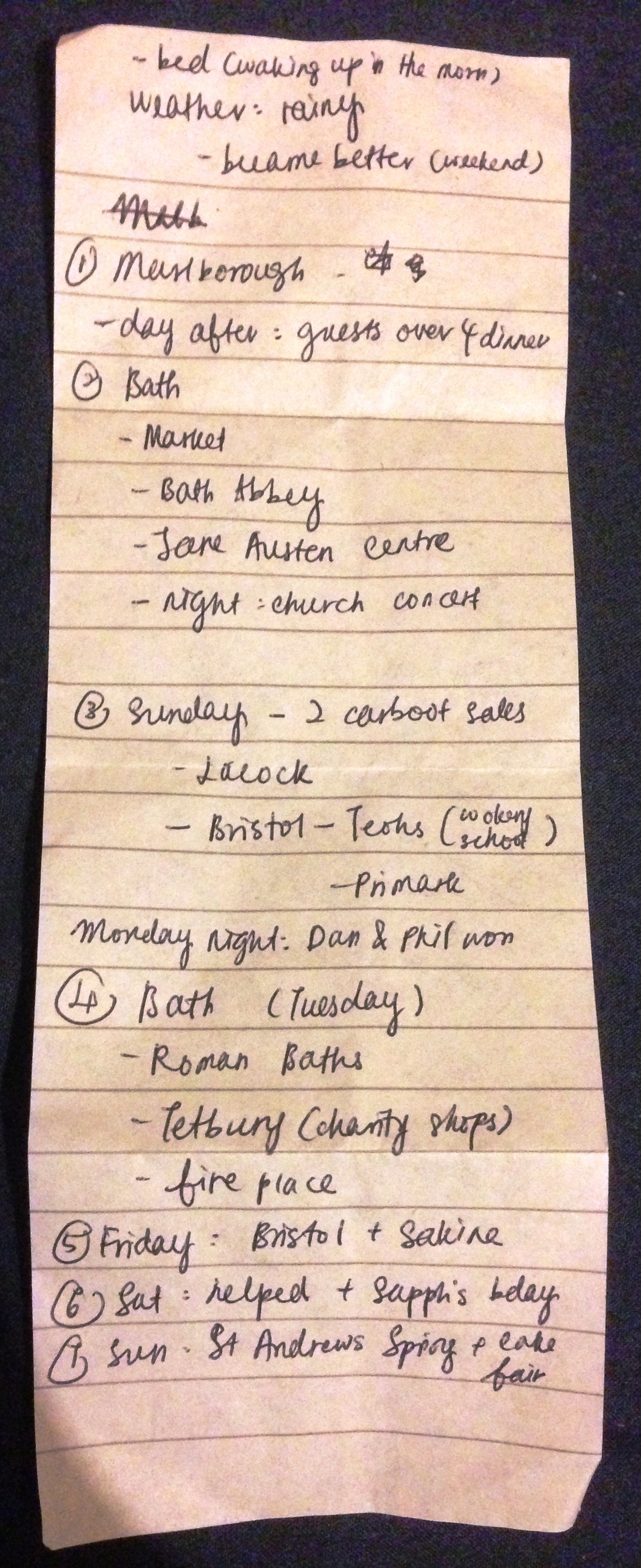 Anyway, with that out of the way, I shall proceed to give you a brief summary of what happened over the week as I was blog-less. As you can see on the left, I made a list of events so I don’t forget. And also because I like to make lists. It’s a very useful hobby.