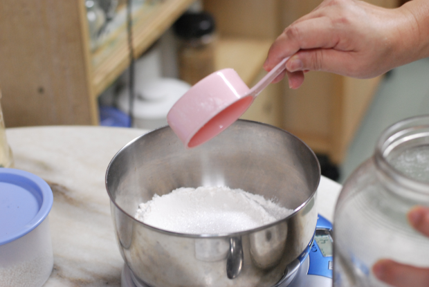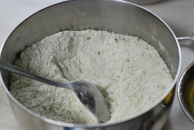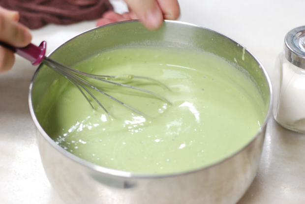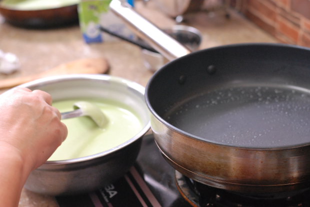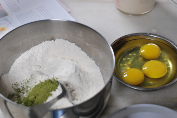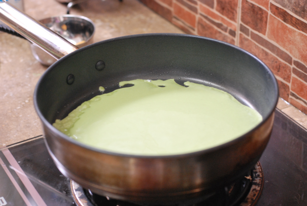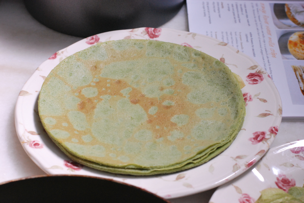 Add flour, eggs, melted butter, matcha powder, salt and sugar into a mixing bowl. Pour in the milk gradually while whisking the mixture. We prepared the batter the night before and left it in the fridge overnight.