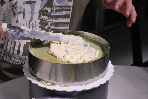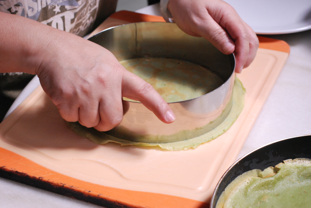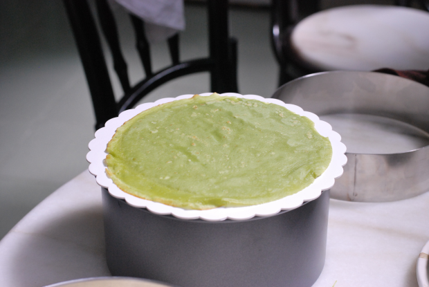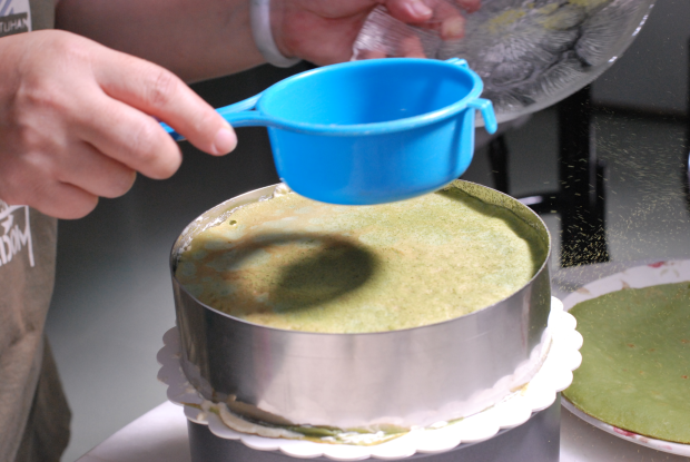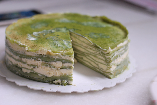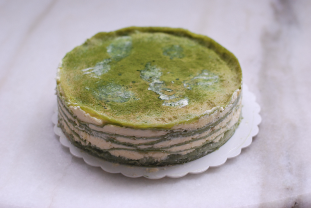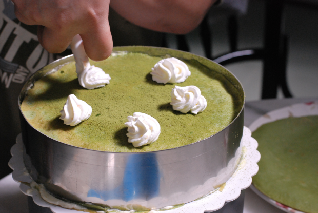 Use a cake mould to cute out the uneven edges to obtain perfectly round crêpe layers. Use a spatula/pastry scraper to spread the cream onto the first layer of crêpe. Top with another crêpe and repeat it until the cream/crêpes run out and/or it reaches optimum height (apparently it’s 6-8cm but life has no rules about cake heights). Decorate the top of the cake however you want – in our case we dusted with matcha powder and sprayed whipped cream.