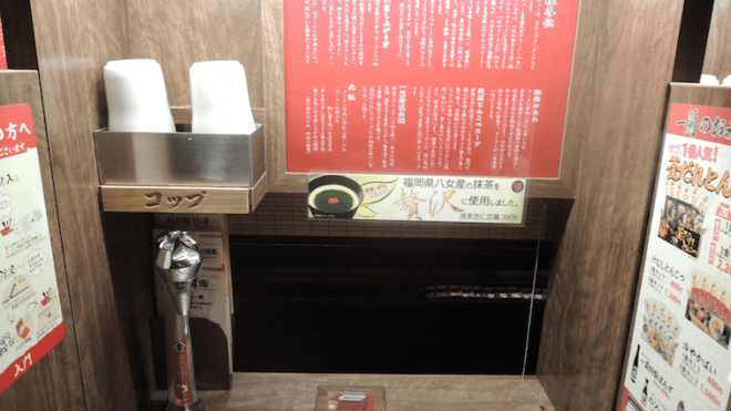 Each person gets a cubicle like this (there are partitions separating each person’s cubicle which you can fold up if you want to)Place ticket + form in front of the gap in front of you (which is actually the kitchen)Drinking water tap for your bottomless refilling needs
