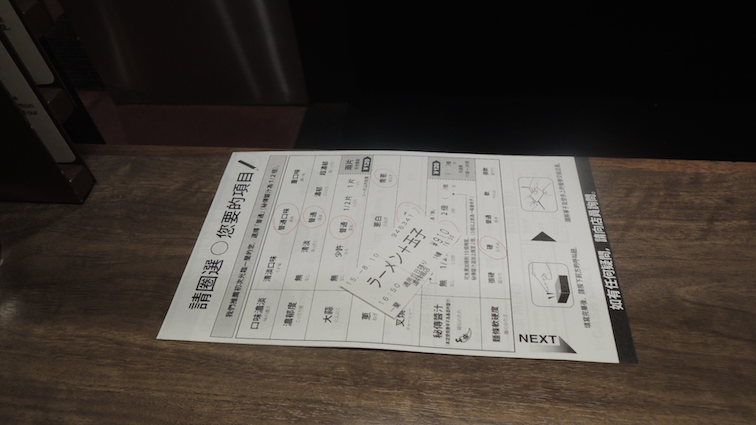 So I was surprised when we went up one floor and were given a piece of paper each by a server. On the paper were several rows of food details such as “soup consistency”, “spiciness”, “hardness of noodles” etc and in different columns, choices like “concentrated/normal/diluted”, “very spicy/normal/non-spicy”, “hard/normal/soft” etc for us to circle our preferences and I was both very shocked and fascinated (it felt like a cooking game). We brought the papers with us and went up another floor where the seats were (perhaps the next part should be explained with pictures).