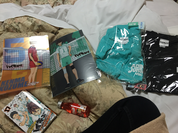 Kenma files, Oikawa files, Aoba Johsai and Nekoma T-shirt, the latest volume of the manga (which had heartbreaking Seijou extras now available for my constant perusal) and a 95ml Nekoma strawberry flavoured drinkIt survived immigration and customs and remains unopened to this day…what does it taste like, no one will ever know