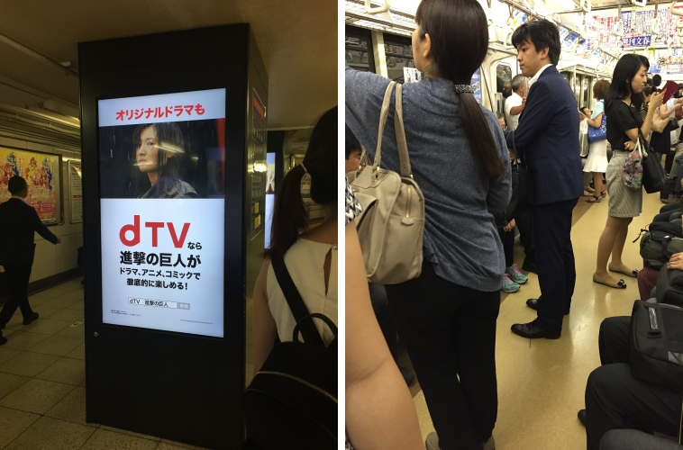 I started to pay more attention to the subway after that when we commuted from Ginza to the JR Tokyo Station now that my nausea and fatigue had been temporarily put on hold until further notice. Enough attention that it didn’t escape from my gaze the Attack on Titan live action movie trailers they kept on replaying on mini TVs in the subway station.