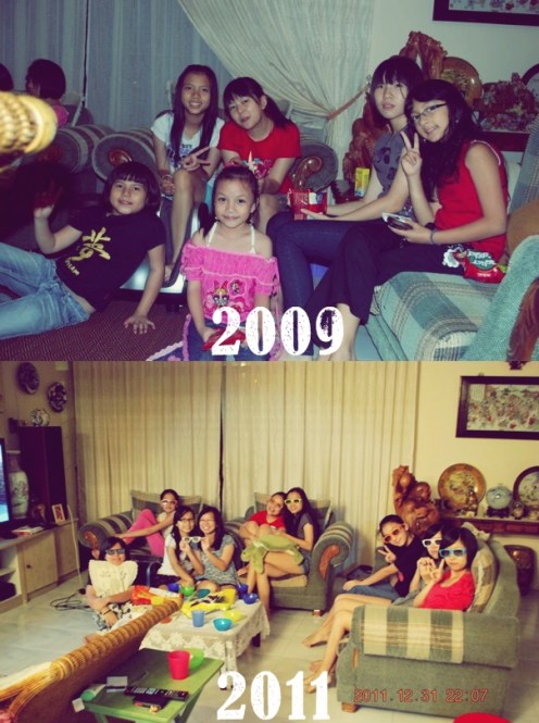 I was looking for old photos on my mum’s Facebook profile when I stumbled upon two albums that made me start. I found the first photo dated 9th June 2009 in my 14th birthday album and the second photo in the countdown to 2012 album. What made me start was how eerily similar both photos were. Jia Yuan and I (the one in the red shirt with her hair tied in a ponytail) were both on the same couch and I was wearing the same shirt in both photos. Both Jia Ying and Xin Tong’s poses and positions were also similar, and the most important thing is none of this was planned, obviously. When you come to think of it, it’s quite scary and wonderful at the same time.