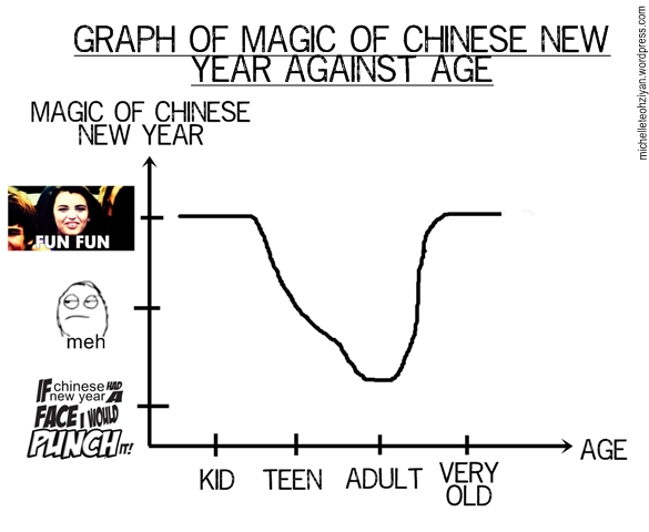 To make a comparison, Chinese New Year for Michelle the young child was always the ultimate climax of the year, and I was never disappointed. I was always so happy to be around my family, especially my cousins. I got to wear pretty new clothes and receive many angpaus. Even the atmosphere was obviously different. There used to be a special buzz in the air on the first day of Chinese New Year, and if I was lucky enough, on the second, third and fourth day too. I wish I could remember enough to put my long-gone ecstasy into words but times have changed drastically and it was as if I’ve shed the wings of magickery as I walked the Trails of Growing Up. That’s the worst pain of growing up: you start to see things and people as they really are, and your heart aches when you realise that some things and people were never as great and wonderful as you’d always thought them out to be. The Warlock of Age starts to wave the banner bearing the words “Congratulations! You are now able to see the rotten side of creation!” in your face.